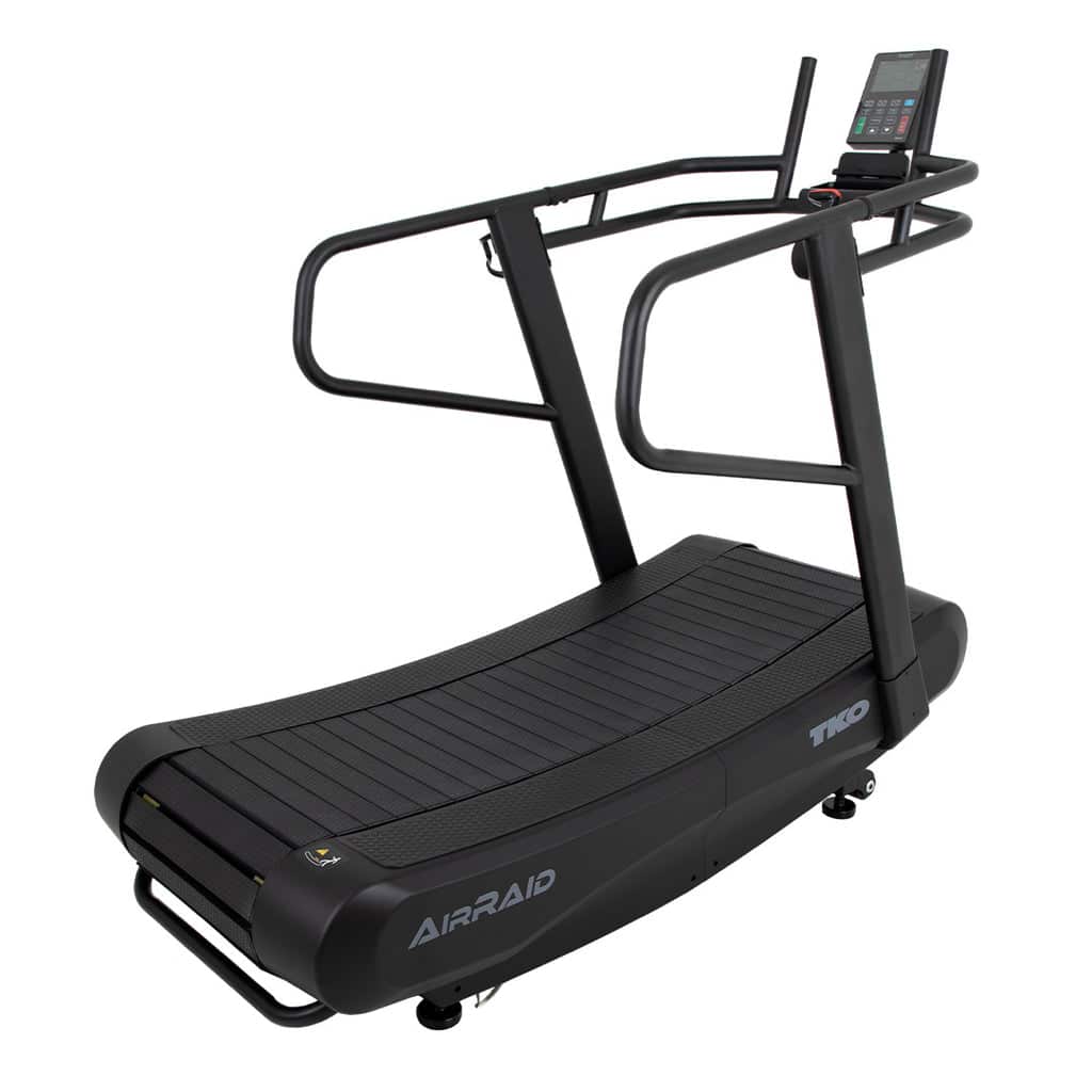 TKO AirRaid Runner offers the benefits of a self powered treadmill as well as the option of 4 levels of resistance for higher intensity interval training. The belt give a impact reducing molded slats on sealed bearings for a smooth and quiet movement. Perfectly placed handrails for causal walking or intense push sled simulation.. The console is equipped with interval training programs that are perfect for crossfit and HIIT.